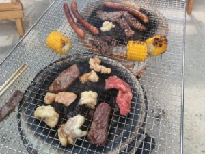 バーベキューコンロも何人用と人数表記がありますが、七輪ではマックスでも3人。いいペースで食べるには2人が限界でしょう。2個の七輪で7人が食べるのに何とかならないかというのもやっていきます。