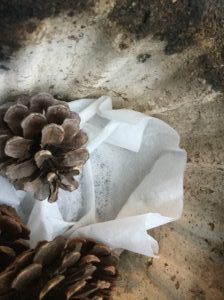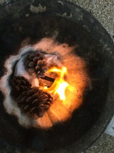 ティッシュにスターターのマグネシウムを少し削り近くに松ぼっくりを置きます。