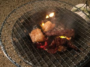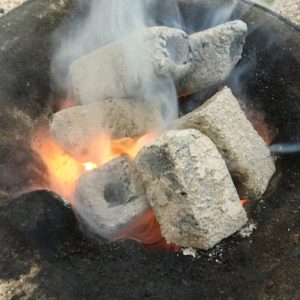 これは外遊び屋が目から鱗の着火方法でした。みんなが大好きな焚火をまずします。炭火に比べて焚火は着火がらくですから。みんなが焚火の回りに集まっているときに炭を放り込む。程よいところで火ハサミで拾い上げて完了。面白いなぁと思いました。