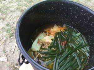 焚火に鍋を吊るしたいだけの野趣あふれる料理です。