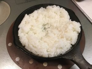ご飯をスキレットにひいて、気持ち焼いておきます。