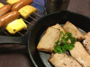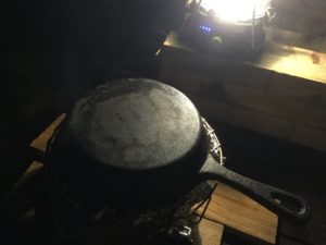スキレット2枚と網。チップとバーナーがあれば十分。