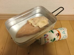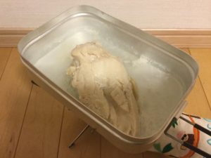 蒸すときの水の量は鶏肉が1/3程度のところで止めてます。