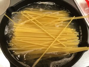 良い茹で加減のところで水が残っていたら水を軽く切ってください。