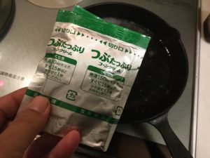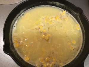 スキレットで湯を沸かしたところでコーンスープを