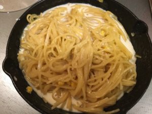 続いてはスキレットで煮込みパスタです。