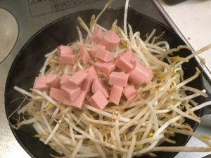 ランチョンミート代わりの魚肉ソーセージを入れます。