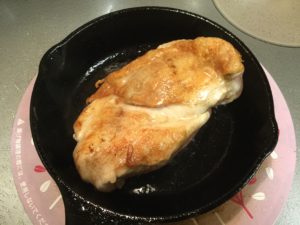 ふき取ったら、スキレットに鶏肉を戻して、
