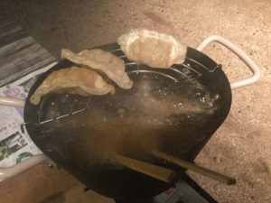 意外と油が散っても気にならないのが外での揚げ物。