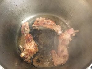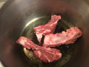 オリーブオイルたっぷり引いてスペアリブを焼きます。