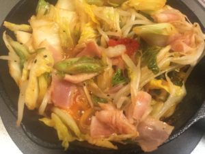 ベーコンの旨味をもやしに移していこうっていう作戦です。