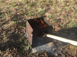 とりあえず落ちている枝などを放り込んで炭に強制着火していきます(^^