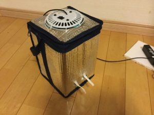 クーラーボックスで冷やした空気をサーキュレーターで押し出す。