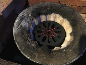 豆炭に火が着いているため熱も上にあがるので普通にオガ炭に火をつけるよりは早く、また火が着いたときには七輪もあったまっているので