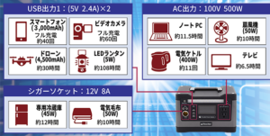 ※家電からスマホまで幅広いジャックが使えます。シガーソケットで使える家電も12V(普通車レベル)の物が使用できます。