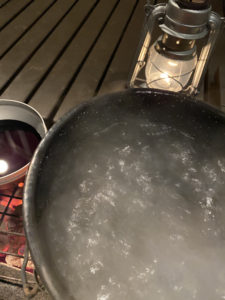 早速炭火を熾したら鍋にしっかりと水を張って湯を沸かします。