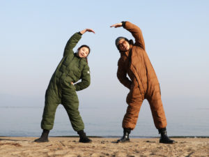 ツナギのような寝袋を身にまとっているイメージでしょうか。これはよいアウターです!