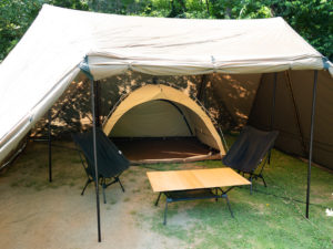 ドーム型テントではなく、大きなシェルターの中に設営してカンガルースタイルを選ぶこともできますし、