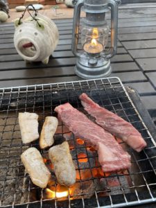 相方から貰ったネーム入りのククサでお酒を飲みながらお肉を焼く!