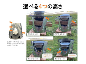 4段階にスピットの高さを調節できるので遠火近火はもちろん、焚火台自体を風防として使用できます。